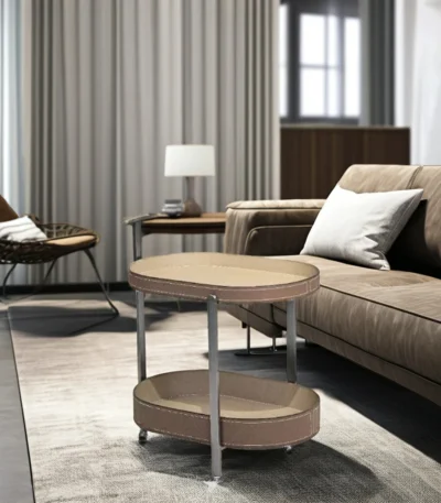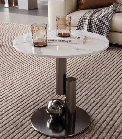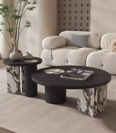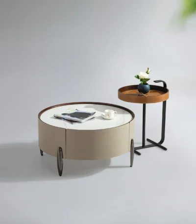 Snow White Round Coffee Table Set with Stone Top and Barenia Leather Accents