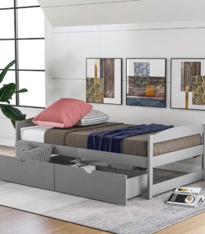 Twin size gray pine bed with two large storage drawers, durable construction, and space-saving design for a sleek, functional bedroom upgrade.