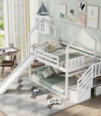 Charming white house-shaped bunk bed with slide, storage, and staircase, perfect for maximizing space and fun in your kid's room.