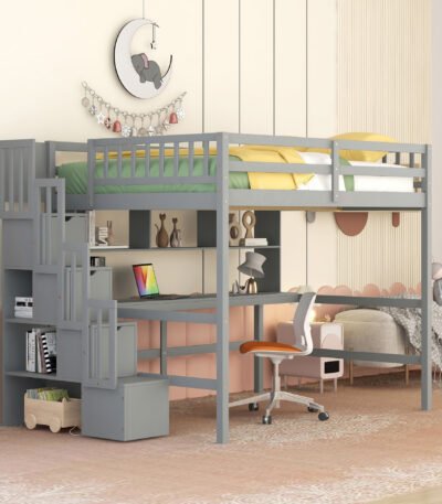 Ultimate Grey Pine Loft Bed with Study Desk, Storage & Staircase – Space-Saving & Stylish