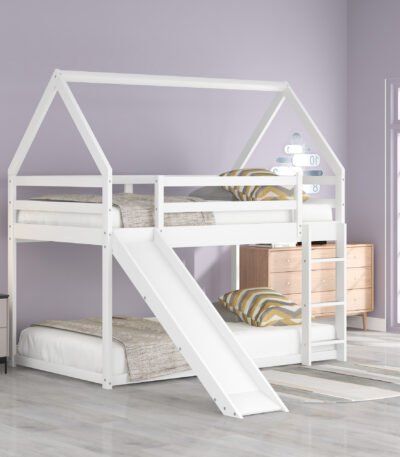 Cute house-shaped bunk bed with slide and ladder, perfect for active kids. Durable, safe, and easy to assemble for endless fun and sleep.