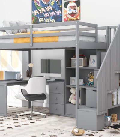 Stylish Gray Pine Loft Bed with L-shaped desk, storage, and staircase—perfect for maximizing space and functionality in small bedrooms.