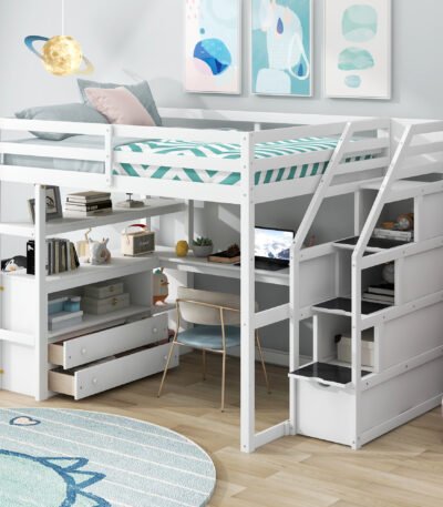 Stylish white loft bed with integrated storage, desk, and stairs—perfect for maximizing space and organization in any child’s room.