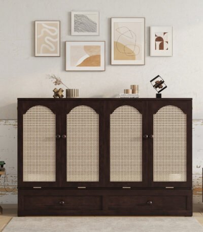 Espresso Pine Cabinet Bed – Space-Saving Murphy Bed with Power Station & Rattan Decor