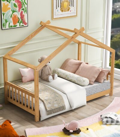 Cute twin house platform bed with roof, crafted from durable pine wood, easy to assemble, safe, and perfect for inspiring kids’ imagination.