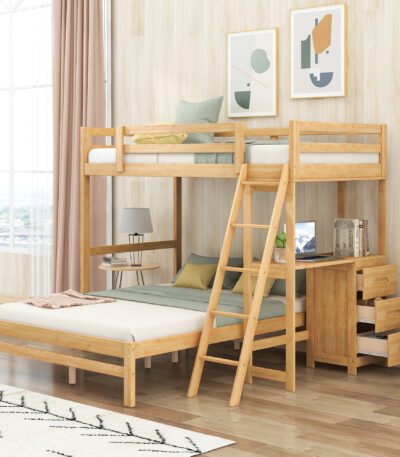 Premium natural pine bunk bed with built-in desk and storage, perfect for space-saving, durable, and stylish bedroom solutions.