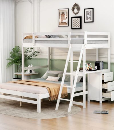 Elegant White Pine Bunk Bed with built-in desk, drawers, and versatile layout—ideal for space-saving comfort and style.