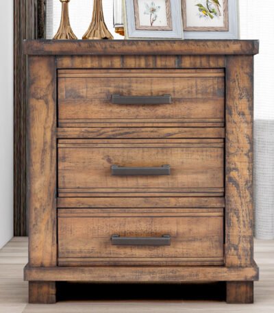 Reclaimed Pine Wood Nightstand with Three Drawers and Wrought Iron Pulls – Natural