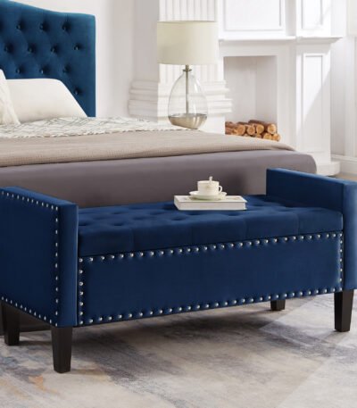 Velvet Upholstered Storage Bench with Tufted Buttons and Armrest – Navy