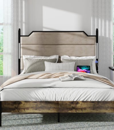 Wood Queen Bed Frame with Upholstered Headboard and LED Lights – Industrial Brown