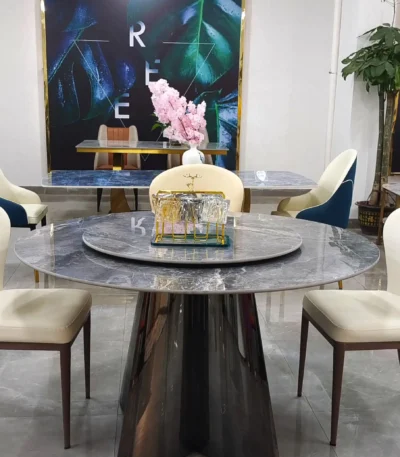 Crystal Stone Round Dining Table with Turntable Mechanism – Titanium Grey Legs