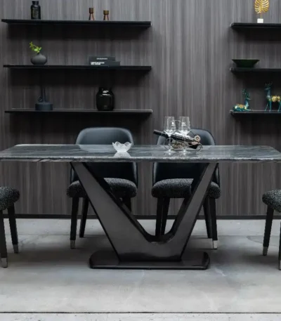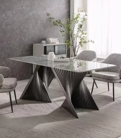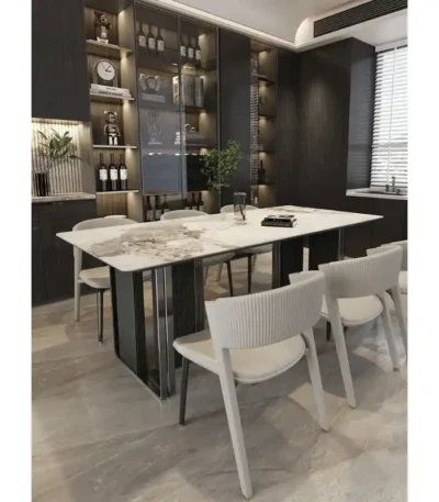 Glossy Sintered Marble Rectangular Dining Table with Double Metal End Feet Base – Elegant