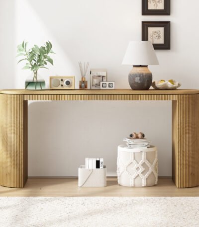 Pine Curved Console Table with Vertical Stripe Design – Elegant Finish