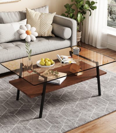 Tempered Glass Rectangle Coffee Table with Black Metal Legs – Brown