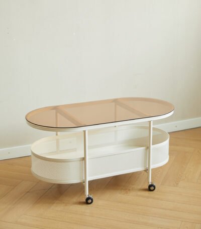 Tempered Glass Oval Coffee Table with Vented Metal Storage and Swivel Wheels – Brown and White