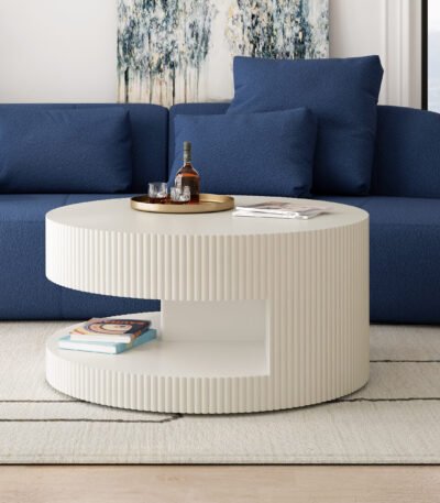White Round Coffee Table with Hidden Storage Shelf – Modern Vertical Stripe Design