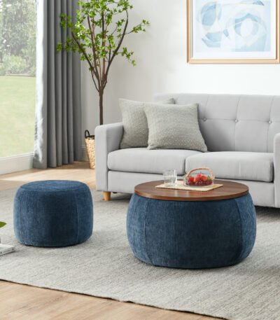 Upholstered Round Storage Ottoman with Removable Top – Dark Blue