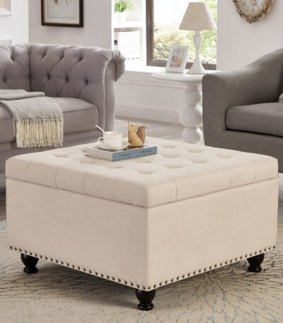 Upholstered Square Storage Ottoman with Button Tufting and Nail Trim – Beige