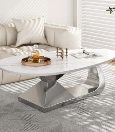 Stylish faux marble sintered coffee table with durable surface and sleek stainless steel base, perfect for modern living rooms.