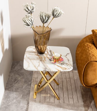 Marble Pattern MDF Square Side Table with Gold Stainless Steel Base – Contemporary Design