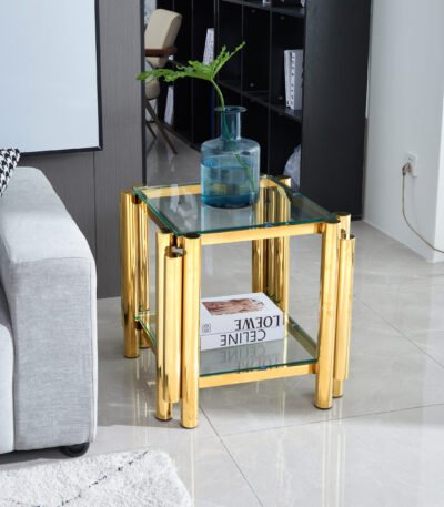 Stainless Steel Square End Table with Double-Layer Tempered Glass – Gold