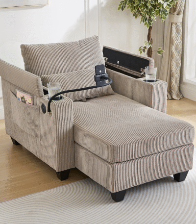 Soft Corduroy Convertible Chaise Lounge with USB Ports and Hidden Storage – Brown