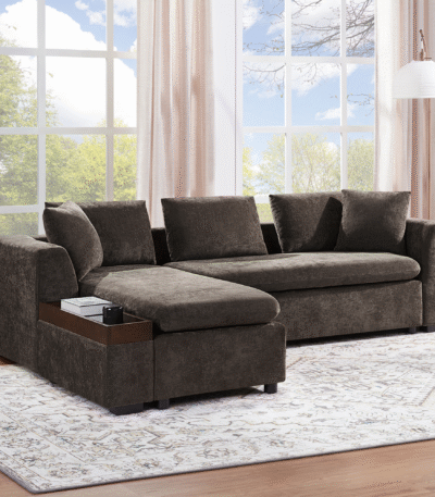 Chenille L-Shaped Sectional Sofa with Wooden Storage Compartment – Brown