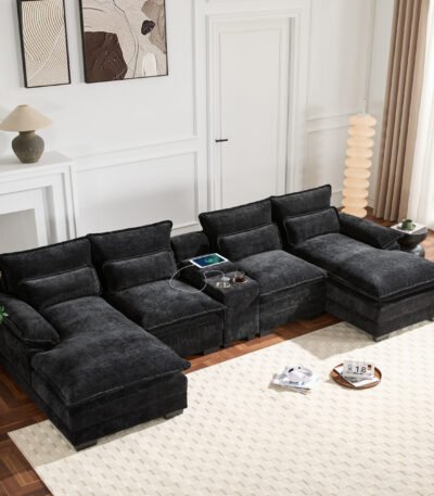 Chenille U-Shape Sectional Sofa with Console, Cup Holders, and USB Charger – 6-Seater – Gray