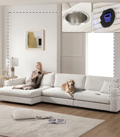 Thick Corduroy L-Shaped Sectional Sofa with USB Charging Port and Cup Holders – 3-4 Seater – Available in 3 Colors