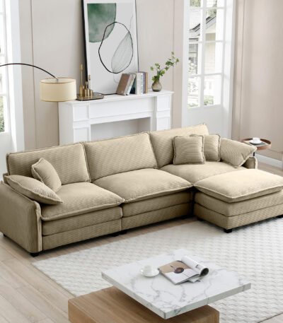 Corduroy L-Shaped Sectional Sofa with Ottoman – Tan