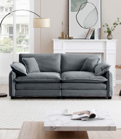 Grey Corduroy 2-Seater Sofa with 4 Pillows – Retro Style Deep Seating