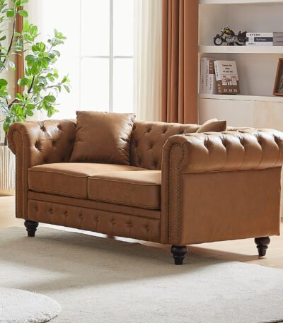 Tech Fabric Chesterfield Sofa with Button Tufting and Nailhead Design – Dark Brown