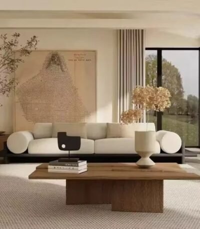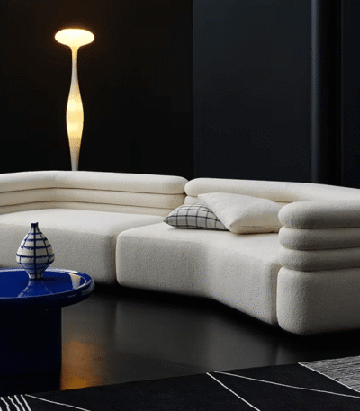 Rice-White Curved Fabric Sectional Sofa with Eco-Friendly Frame – Three-Seater