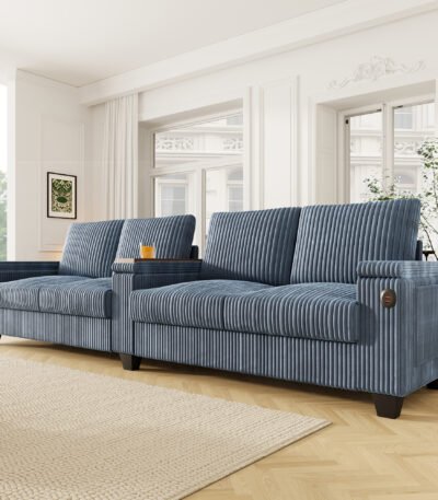 Corduroy L-Shaped Sofa with USB Ports and Hidden Storage – 4-Seater – Blue