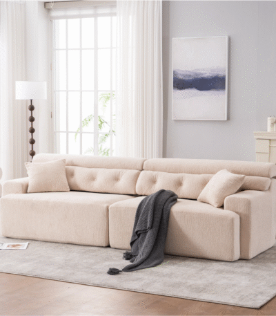 Chenille Fabric 4-Seater Compression Sofa with Wider Armrests and 2 Pillows – Apricot