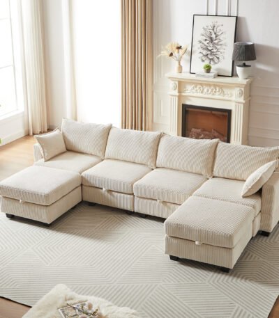 Corduroy U-Shaped Modular Sofa with Storage Ottoman and Convertible Sleeper – Gray