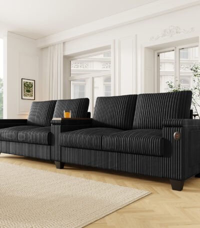 Corduroy Sofa Couch with USB Ports and Hidden Storage – 4-Seater – Black