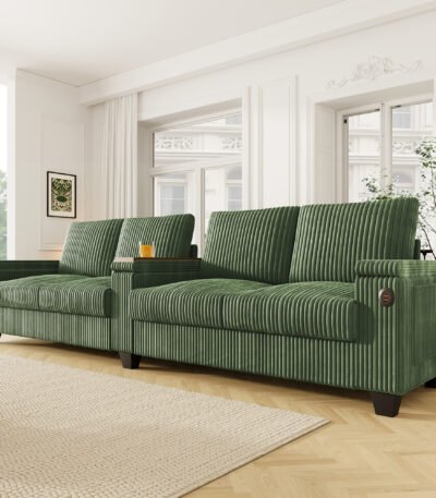 Corduroy Sofa Couch with USB Ports and Hidden Storage Arms – 4-Seater – Green