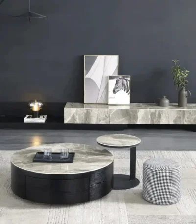 Round Rock Panel Coffee Table Set with Two Side Tables – Light Luxury