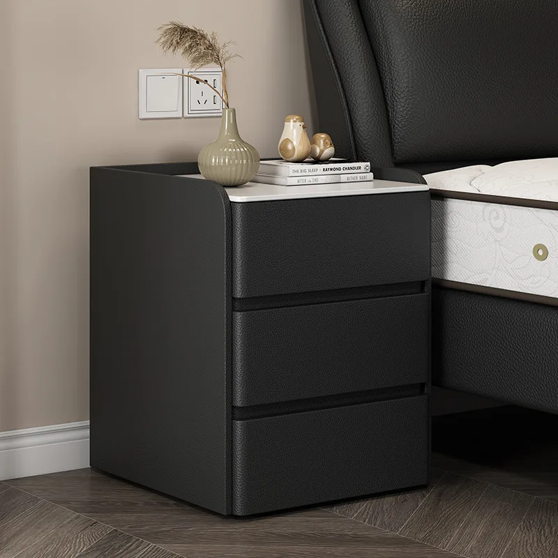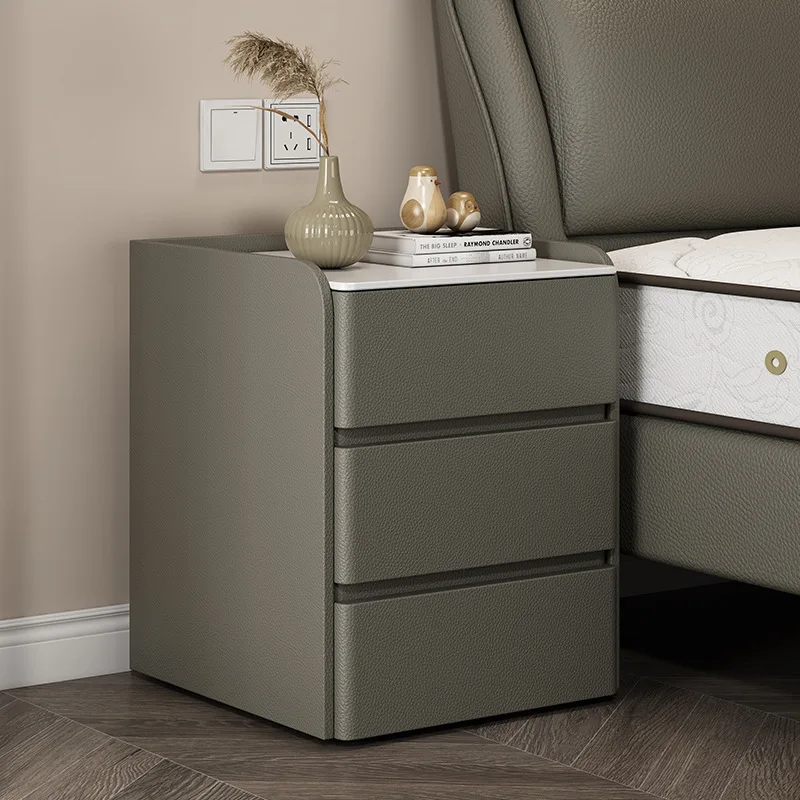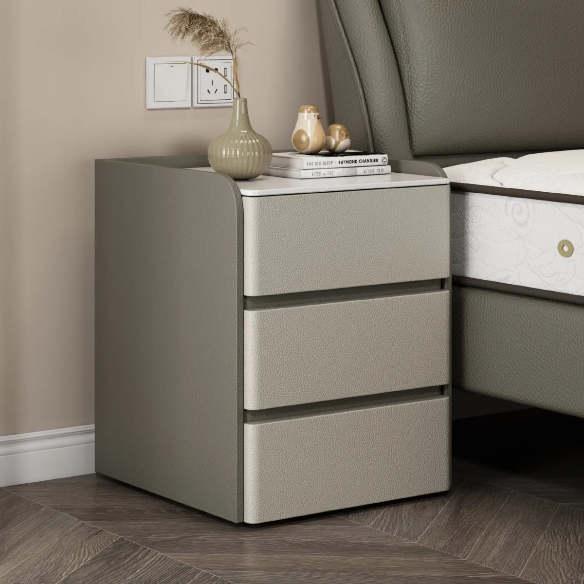 This modern luxury bedside cabinet is thoughtfully crafted to balance simplicity with sophistication. Built from a solid wood structure reinforced with MDF panels, the design is enhanced by microfiber leather accents and durable stainless steel support legs, ensuring structural strength and long-term reliability.