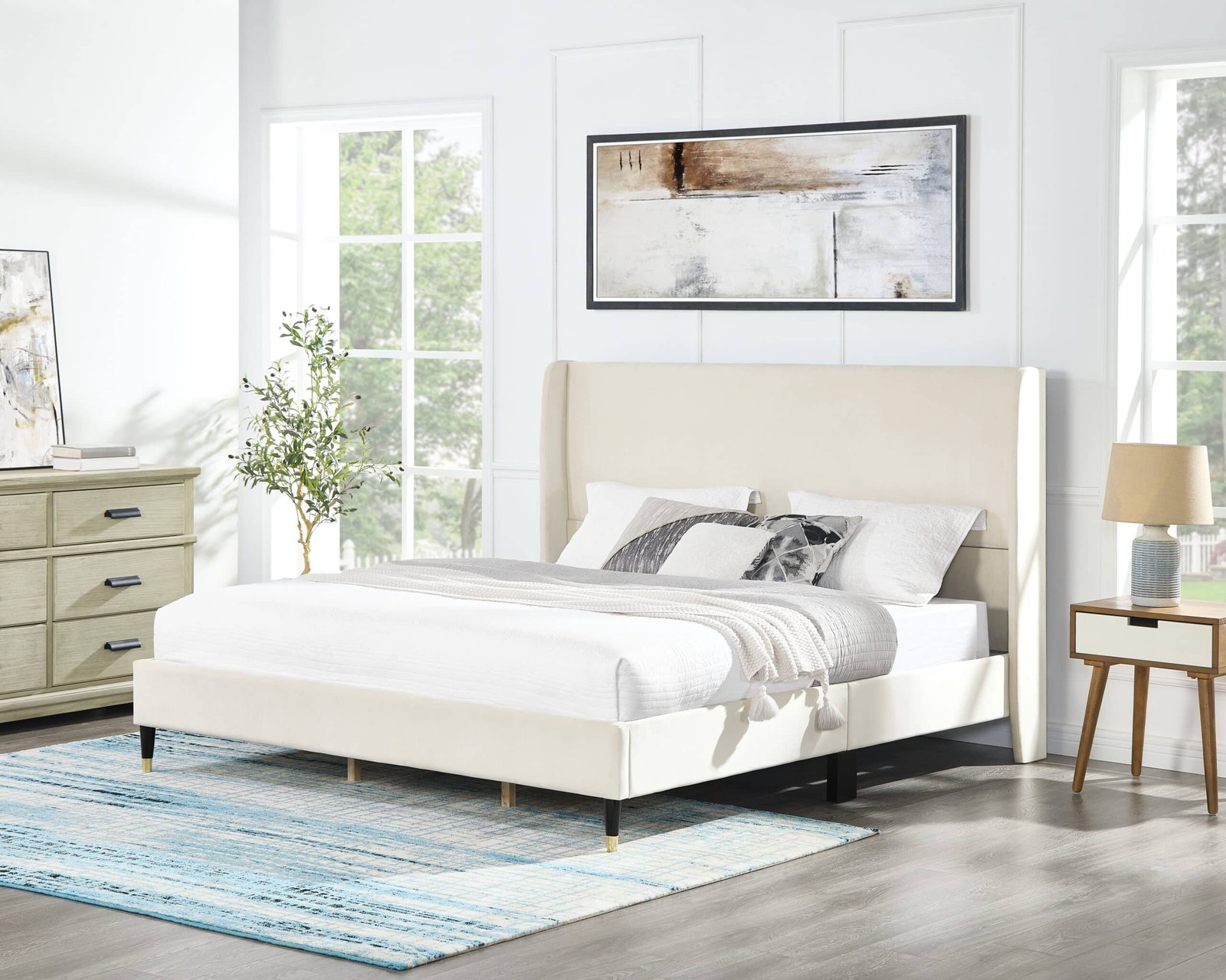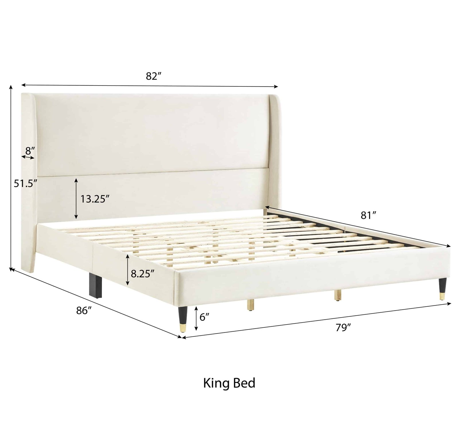 Beige Velvet Wingback Platform Bed with Padded Headboard – King