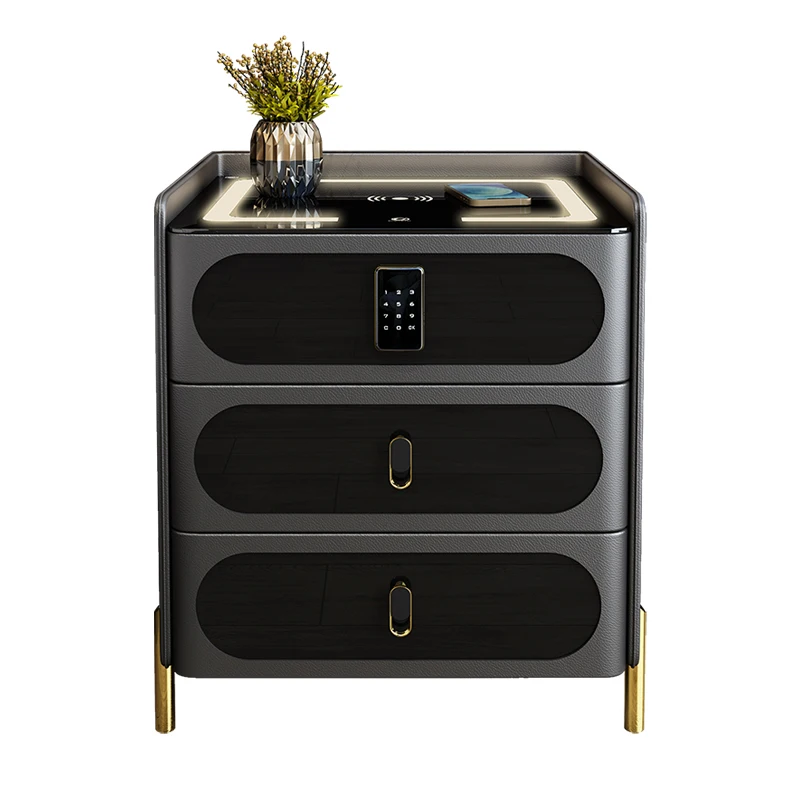 Engineered for modern living, this smart night cabinet blends structural reliability with functional innovation. The solid wood framework ensures stability and long-term durability, while the leather detailing adds a refined surface contrast that complements contemporary bedroom styles. A built-in locking system provides secure storage for valuables, and the integrated charging feature supports convenient device use without disrupting the room’s visual harmony.
