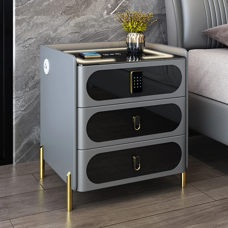 Contemporary Solid Wood Smart Night Cabinet with Security Lock – Minimalist Leather Finish & Integrated Charging
