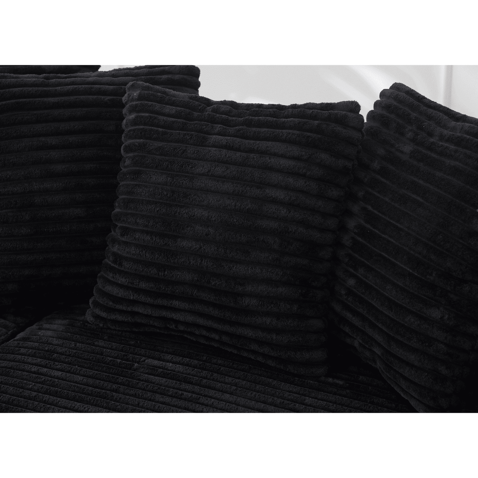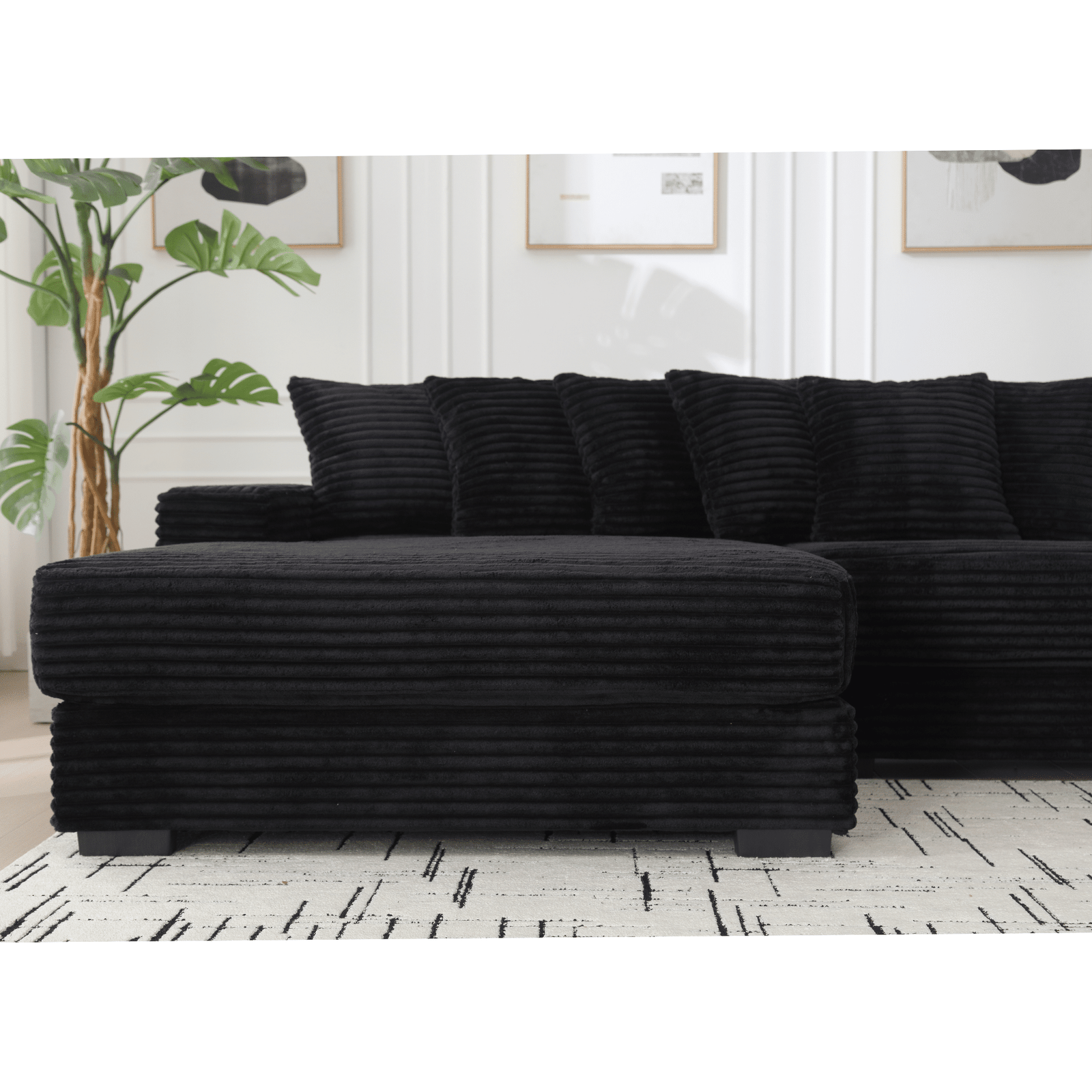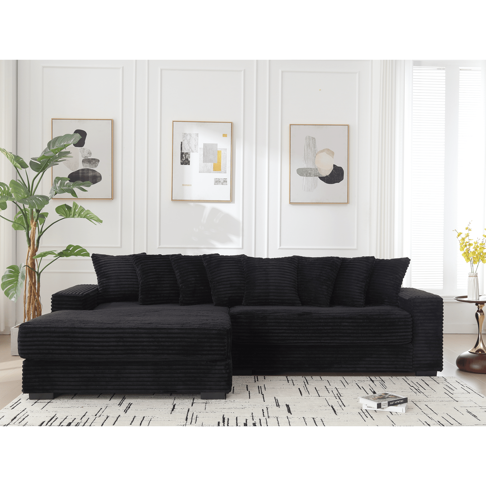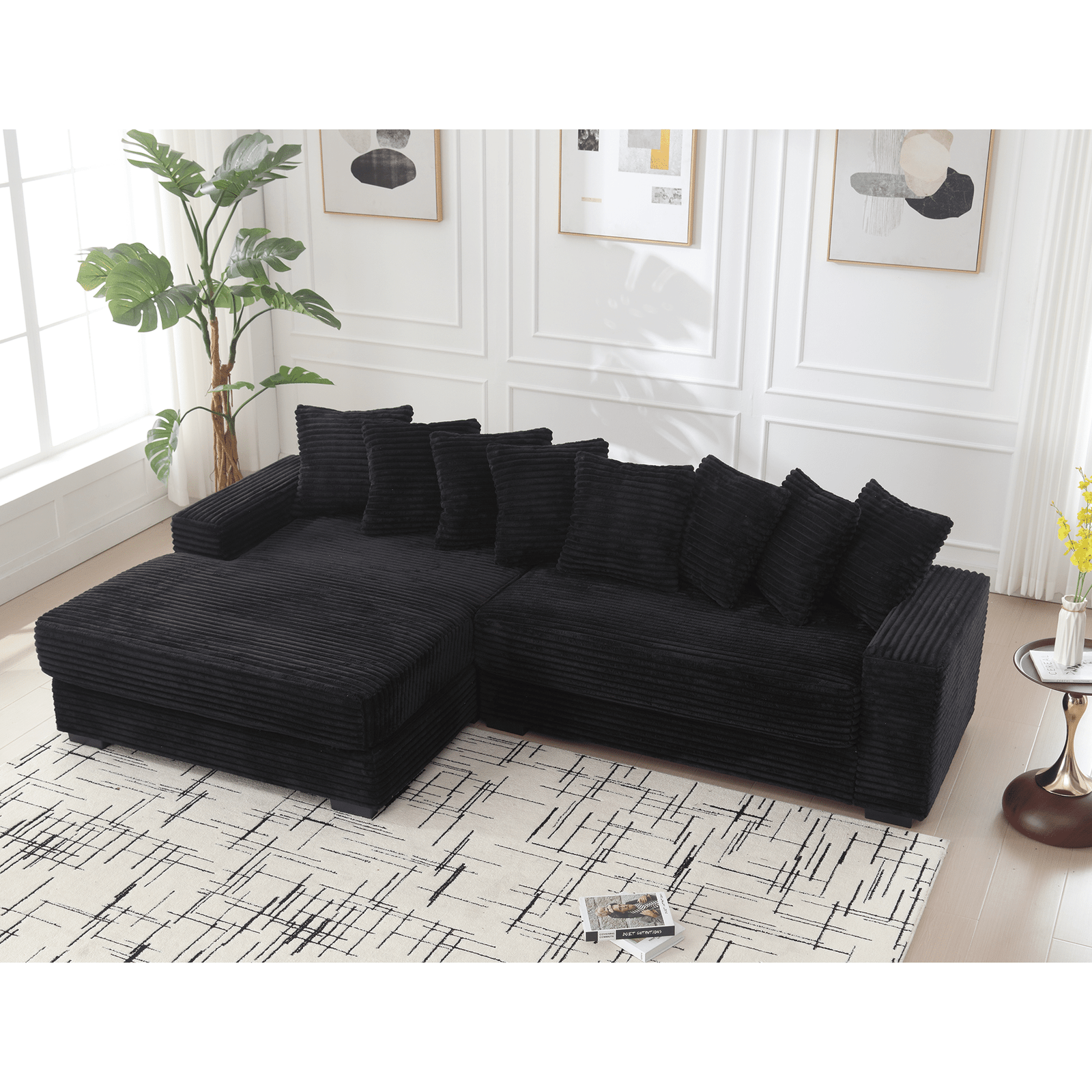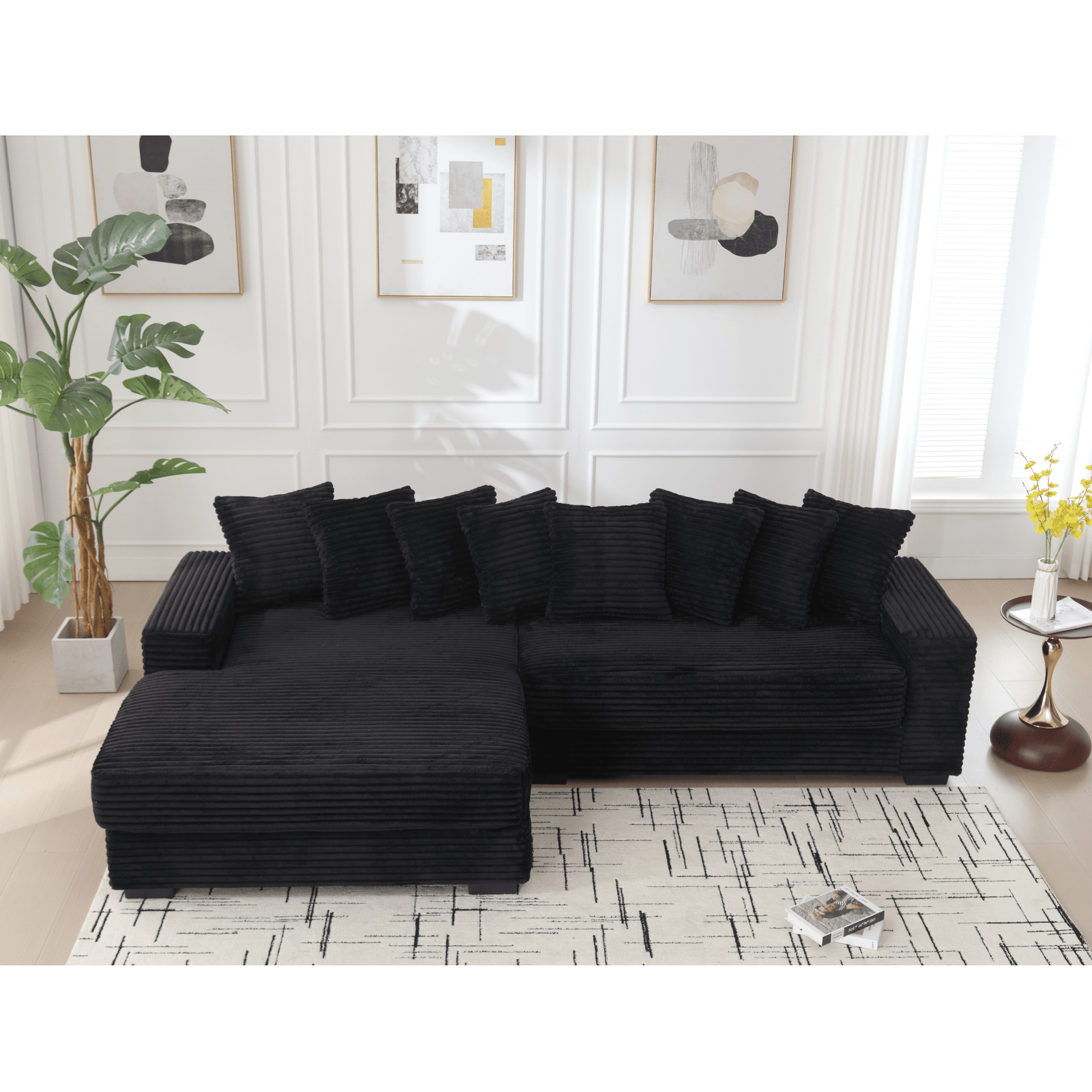 Corduroy L-Shaped Modular Sofa with Left Chaise Daybed and 8 Throw Pillows – Black