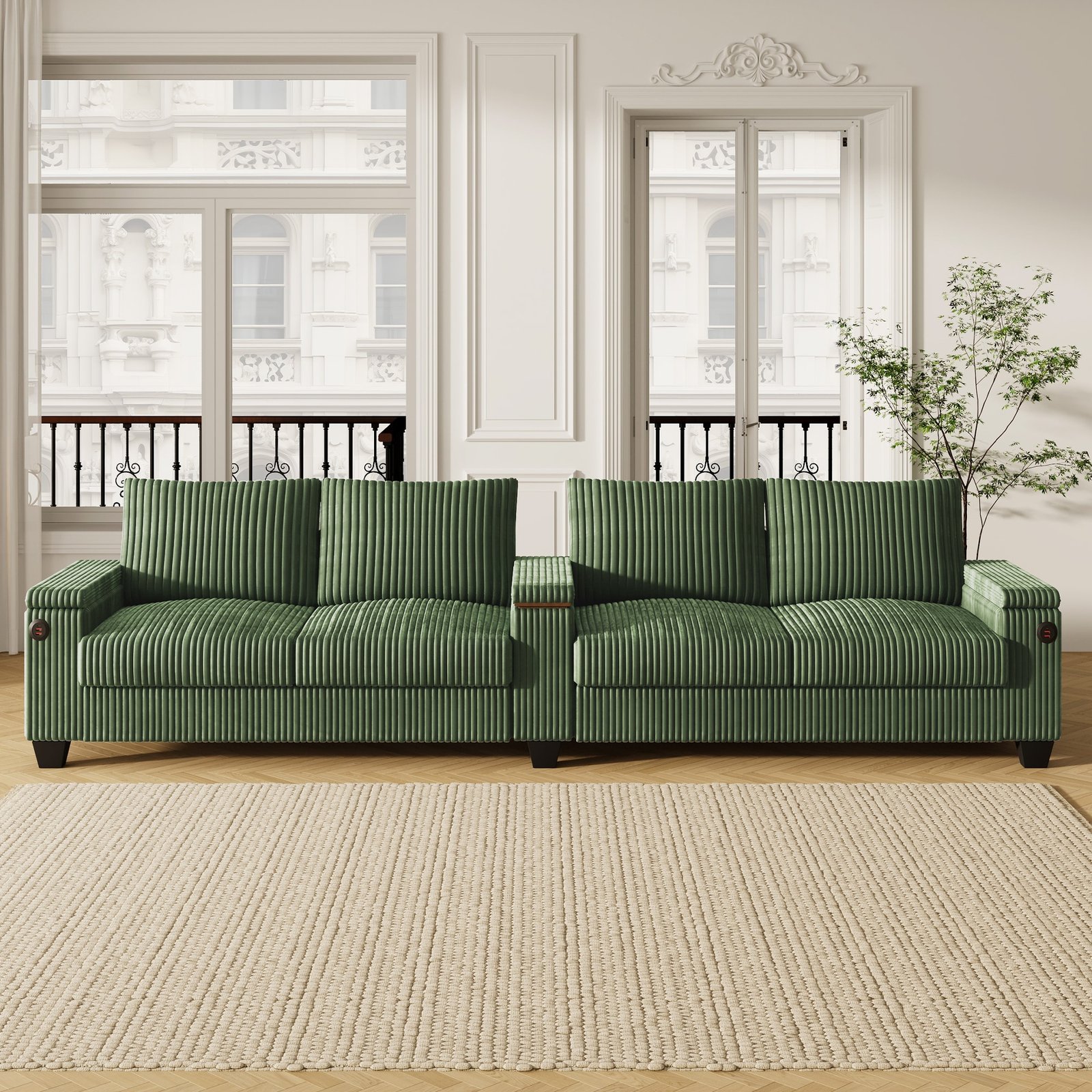 Corduroy Sofa Couch with USB Ports and Hidden Storage Arms – 4-Seater – Green