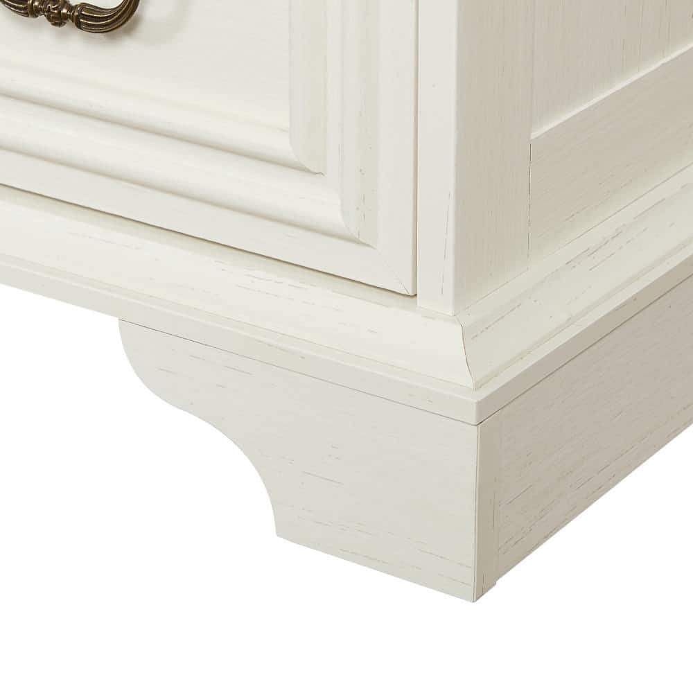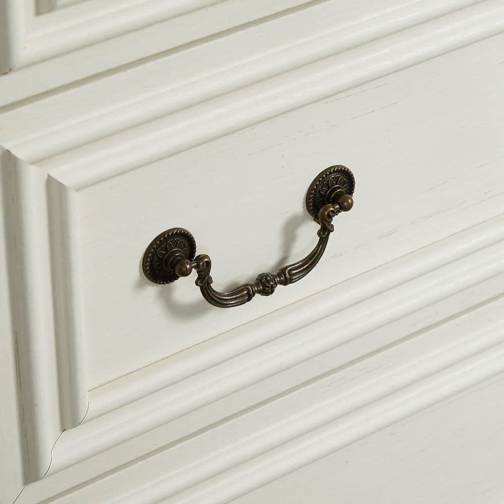 Style: Antique white and brown two-tone finish, embossed textures, beveled edges, Roman column-style handles, and bracket-style feet for a true farmhouse-inspired aesthetic