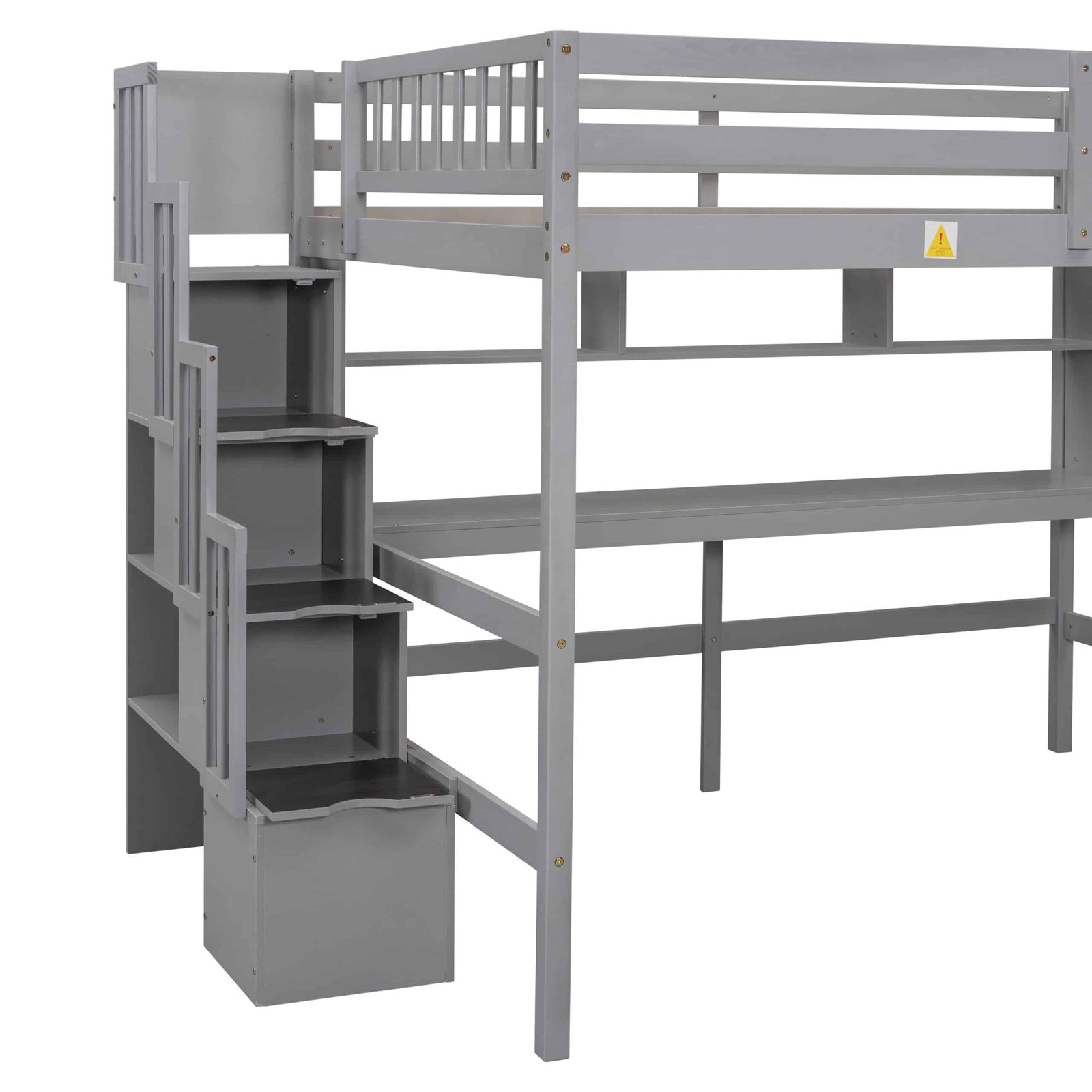 Full Size Loft Bed with Desk, Storage Shelves, and Staircase – Grey
