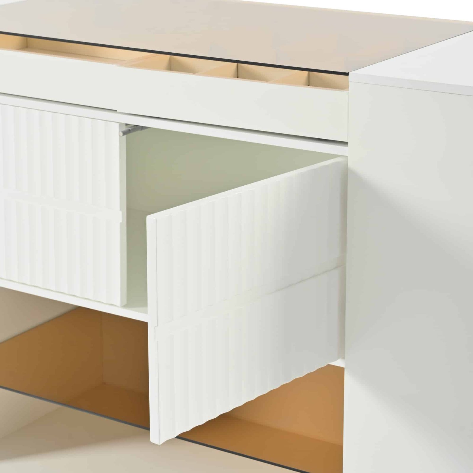Stylish cream white glass vanity with spacious drawers, glass tabletop, and open shelves—perfect for elegant bedroom or bathroom organization.