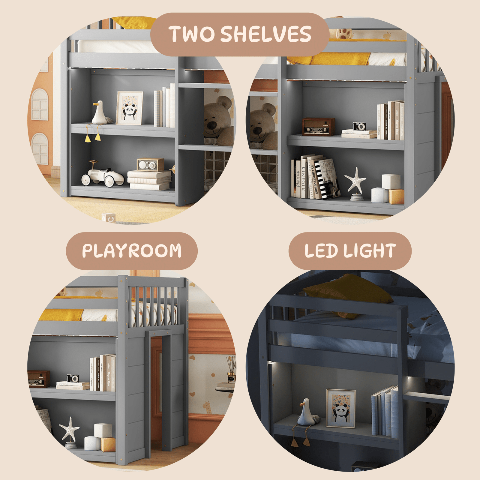 Grey Twin Low Loft Bed with Two-Tier Shelves and LED Light – Kids’ Playroom Design