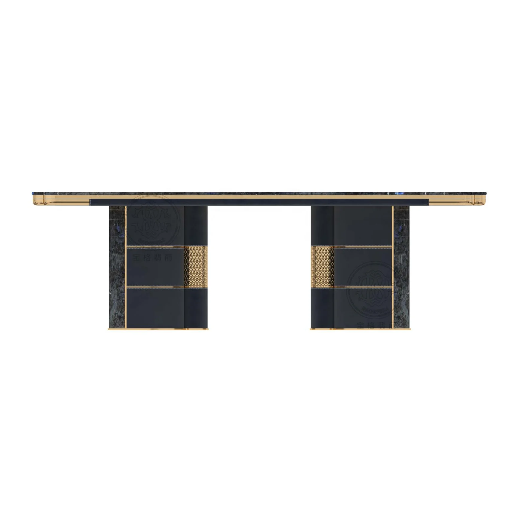 Designed to embody contemporary sophistication, this long rectangular dining table merges deep black tones with elegant gold detailing to produce a refined luxury statement. Crafted from solid wood, the structure provides dependable durability while maintaining a sleek architectural profile. The elongated tabletop offers generous surface space, making it ideal for formal dining settings, hotel suites, villas, and executive interiors.
